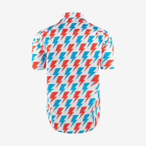 David Bowie All-Over Red and Blue Bolt Short Sleeve Shirt in White Let’s Dance! The David Bowie Red and Blue Bolt Short Sleeve Shirt is designed with a modern fit (between slim & regular fit) and has a perfect length untucked and tucked. It is also 100% cotton resulting in a soft and comfortable feel….