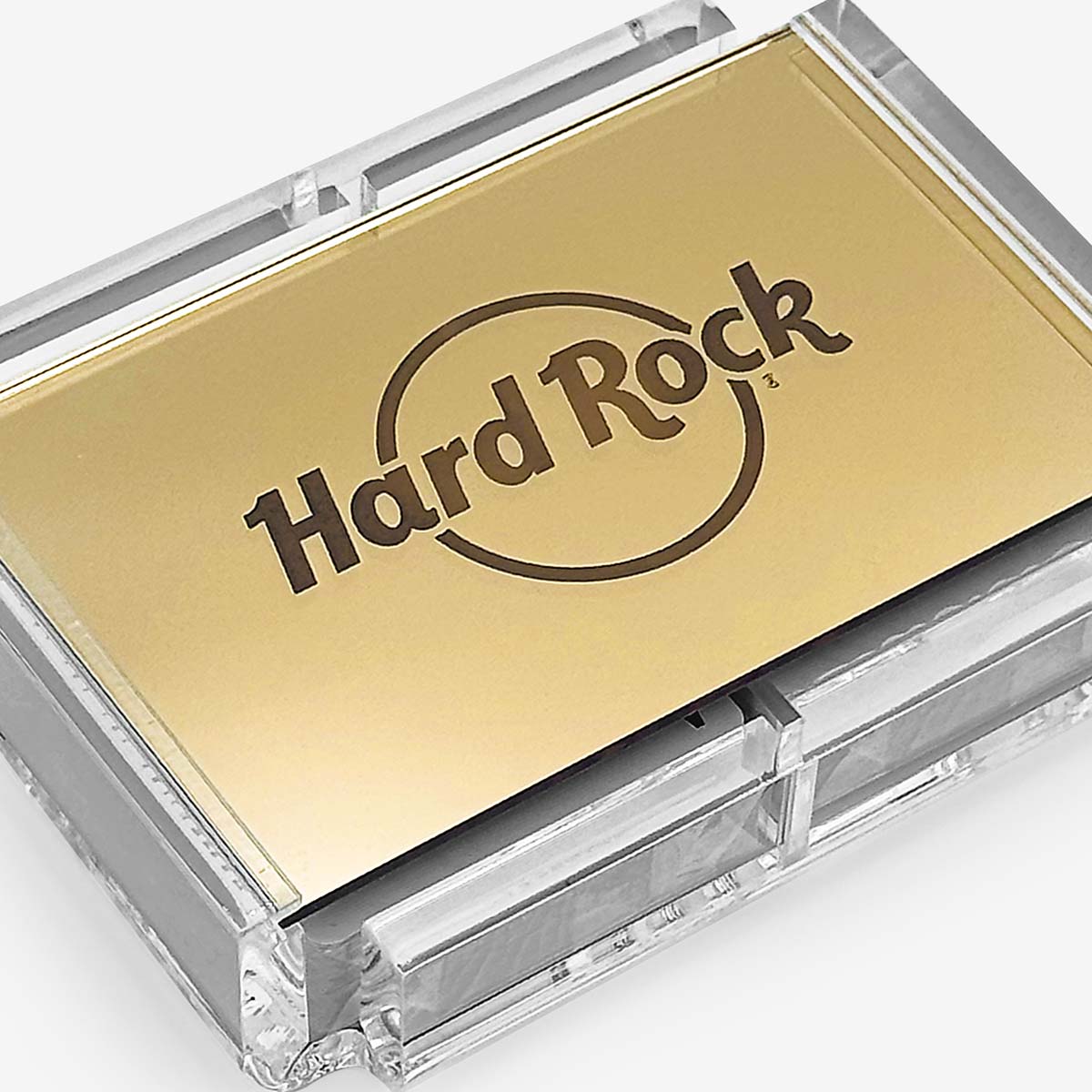 Hard Rock Double Card Deck in Golden Mirror High stakes meet high style. The Luxe Dominoes x Hard Rock Double Card Deck in Golden Mirror is built like a jackpot—sleek, compact, and impossible to ignore. Sealed inside a flame-polished acrylic case and crowned with a gold mirror lid, it’s a bold invitation to shuffle, deal, and dominate the table.