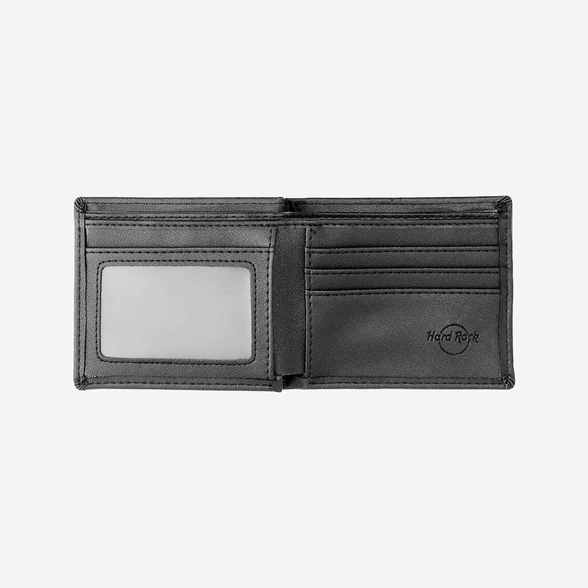 Hard Rock Watch Set with Guitar Wallet in Black Dedicated to all Hard Rock Fans. This set includes a one of a kind Hard Rock watch that is 35mm in size with a stainless steel case, white dial, contrasting dial markers and black vegan leather band. The set also includes a black vegan leather bifold wallet with an embossed electric guitar. Both come in a special giftable Hard Rock keepsake box.
