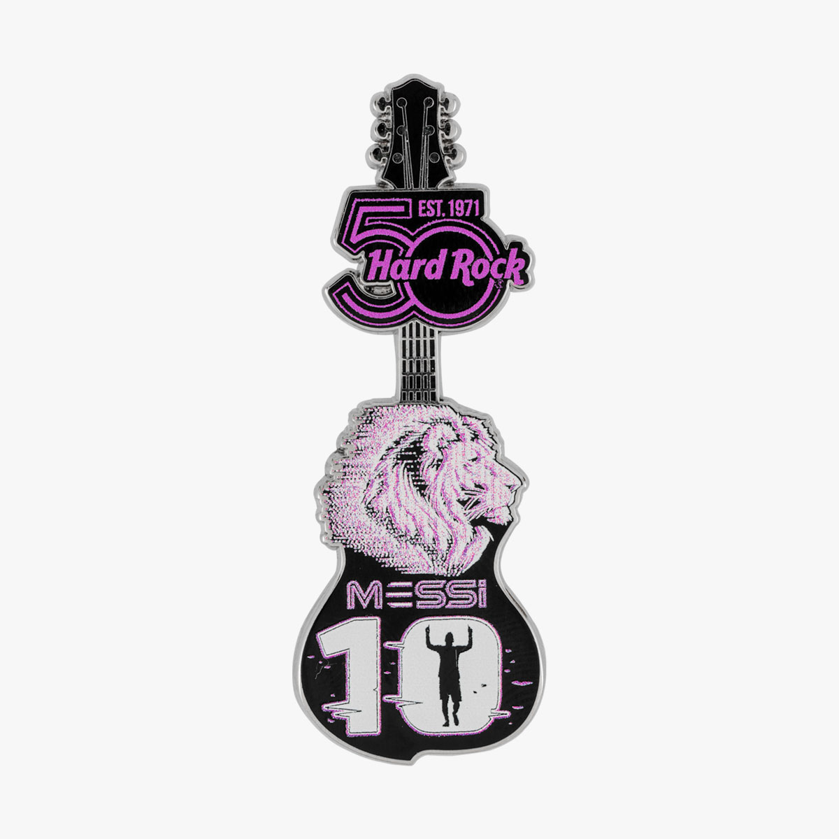 Messi Limited Edition Pin with Lion Head Guitar and Number 10 Design Live Greatness, like Messi plus, celebrate our 50th Anniversary with this Special Edition pin – featuring a Messi lion design and the number 10 wirth a guitar base and special 50th Anniversary logo below the headstock.