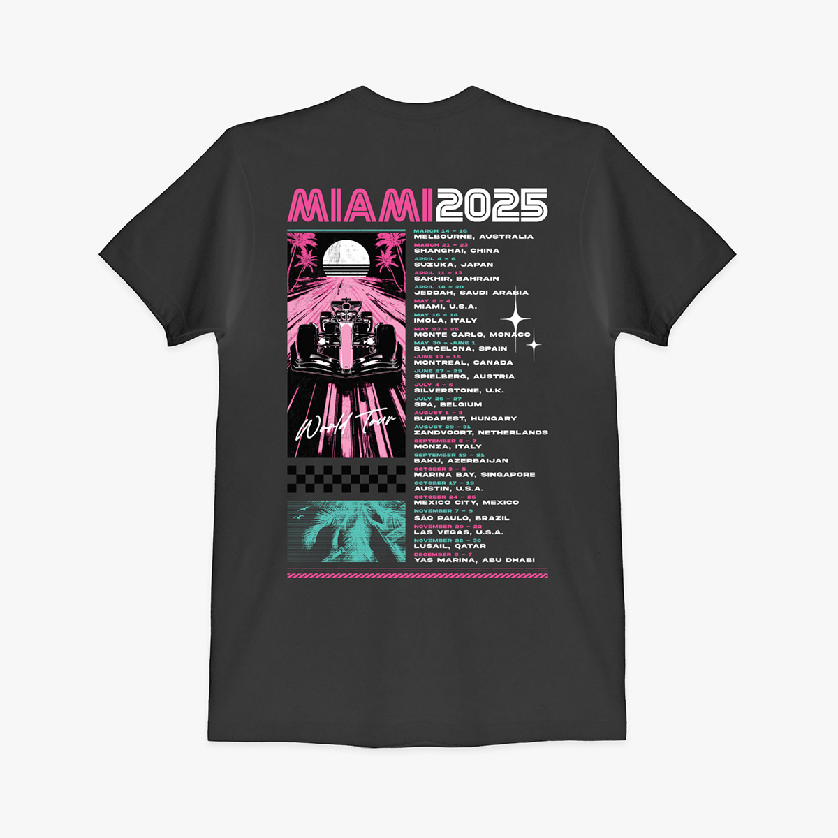 Rep every race on the 2025 calendar with this charcoal tour tee, featuring bold Miami artwork and a global city lineup! Official Oracle Red Bull Racing and Hard Rock logos make it a must for any F1 fan with speed in their soul.